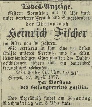 Todes-Anzeige. Gestern Vormittag um 10 Uhr starb unser verehrter Freund und Sangesbruder, der Photograph Heinrich Fischer im Alter von 36 Jahren. Wir verlieren in ihm eine der besten Kräfte unseres Vereins, und die edlen, liebenswürdigen Eigenschaften des Dahingeschiedenen sichern ihm ein dauerndes freundliches Gedenken. Die Erde sei ihm leicht!