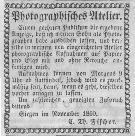 Wir verweisen hier auf einen Text, der unsere Kenntnisse über die frühe Geschichte zu den Siegener Fotografen im 19. Jahrhundert erweitert und vertieft. Peter Kunzmann hat ihn verfasst.